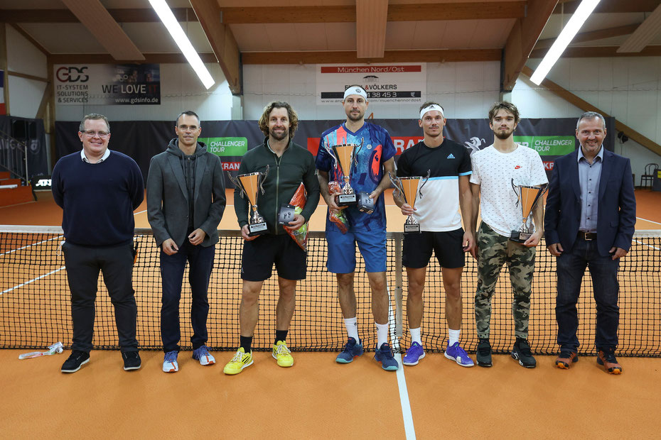 Siegerehrung im Doppelbewerb: (v.l.) Turnierdirektor Christoph Poehlmann, Veranstalter Prof. Dr. Florian Kainz, Andre Begemann, Igor Zelenay, Marek Gengel, Tomas Machac, Veranstalter Dr. Peter Aurnhammer. Foto: Jürgen Hasenkopf